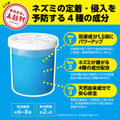 ネズミが嫌がる4種の成分を配合、さらに忌避成分を1.5倍(※当社従来品比)に改良し、製品性能が向上しました。