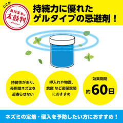 ゲルタイプなので、ニオイが長続きしネズミを寄せつけません。倉庫や天井裏など密閉された空間への設置がおすすめです。